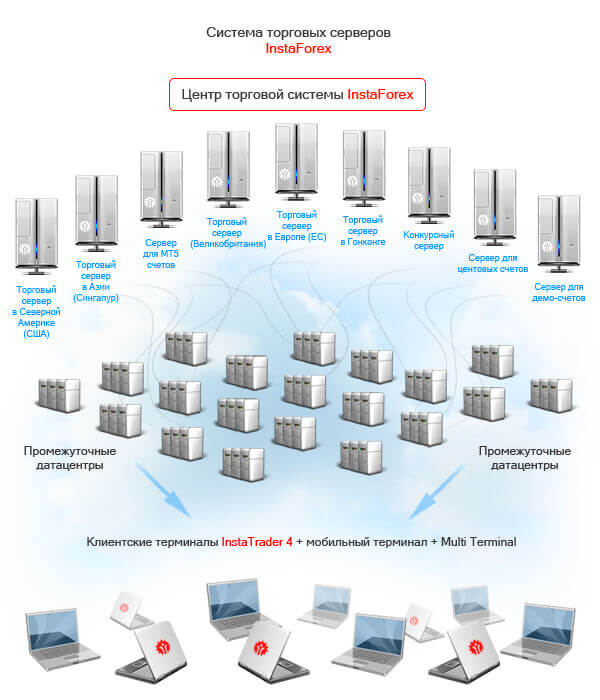 Расположенная выше схема отражает принцип работы и взаимодействия системы торговых серверов и датацентров ИнстаФорекс.