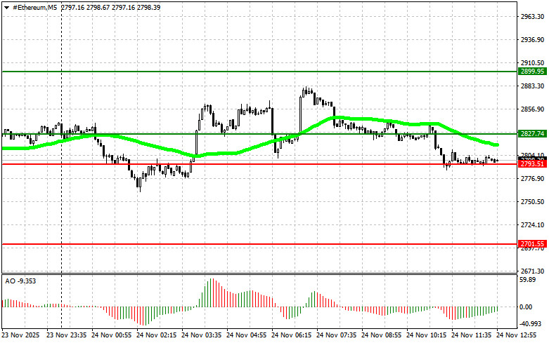 Сценарий №2: покупать эфир можно от нижней границы $2793 при отсутствии рыночной реакции на ее пробой в обратную сторону к уровням $2827 и $2899.