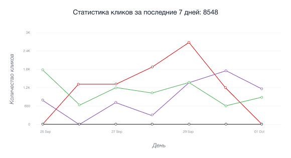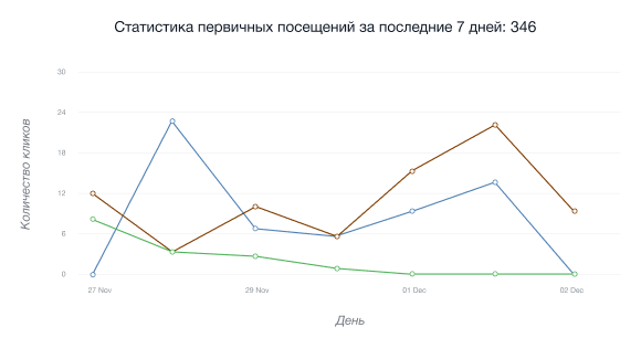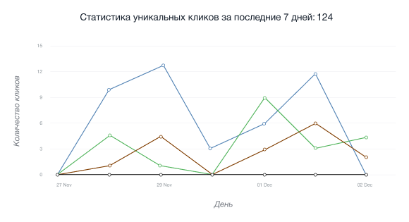 - График уникальных кликов по партнерской ссылке показывает число посетителей, которые впервые перешли по ней с определенного IP-адреса в течение последних 24 часов.