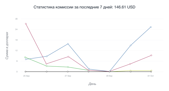 - График показывает общее число переходов всех рефералов по вашей партнерской ссылке и партнерским меткам за выбранный период времени.