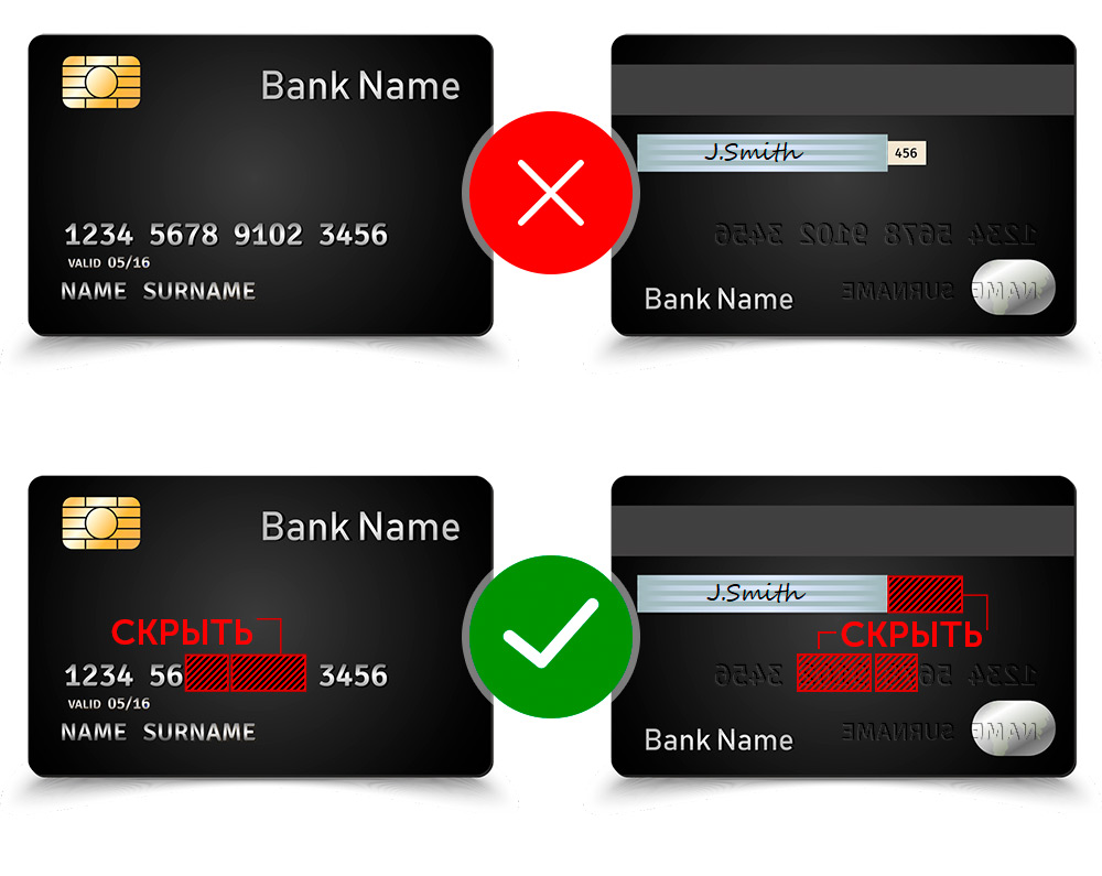 Обратите внимание на то, что загрузка фото банковской карты происходит в клиентском кабинете, доступ к которому имеете только вы. Передача данных в клиентском кабинете происходит по защищенному соединению, а данные наших клиентов хранятся на защищенных серверах. Таким образом мы гарантируем сохранность данных вашей карты от похищения третьими лицами. Кроме того, мы просим всех клиентов перед отправкой нам изображений банковской карты закрывать сенситивные данные, оставляя видимыми только первые 6 и последние 4 цифры номера карты, а также скрывать CVС2/CVV2 код на оборотной стороне карты. Эти меры служат дополнительной защитой от несанкционированного использования данных банковских карт наших клиентов.